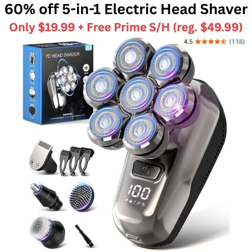 This multifunctional electric shaver comes with 5 interchangeable heads – 7D head shaver, hair trimmer, nose hair trimmer, massage brush, and cleaning brush. Can be used wet, with or without shaving cream, or dry! Safe for use in the shower – keeping stubble out of the sink and off your countertops. Runs for 140 minutes on a 2-hour charge.