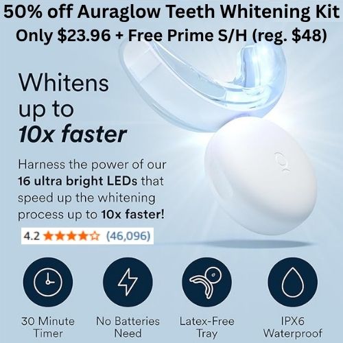 Achieve professional level whitening results at home with this Auraglow Teeth Whitening Kit. It uses an LED light with 35% carbamide peroxide gel to whiten teeth faster, removing years of stains in just 30 minutes. Kit contains 20 whitening sessions. Made in the U.S.A., this kit is highly rated with a 4.2 out of 5 star rating with over 46,000 reviews and it’s the #1 best seller in teeth whitening gels on Amazon right now.