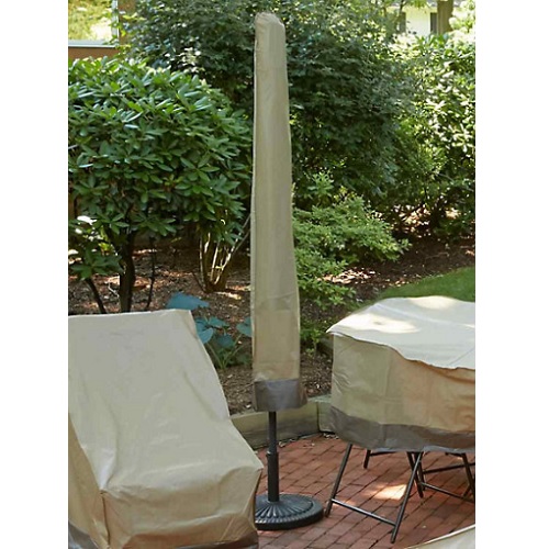 Protect your outdoor umbrella from the elements with this Outdoor Umbrella Cover. Its Weather-resistant embossed vinyl will protect your umbrella dirt, rain and harsh weather. Features a tie down for added security and sturdy nylon zippers. Measures 75″ x 18″.