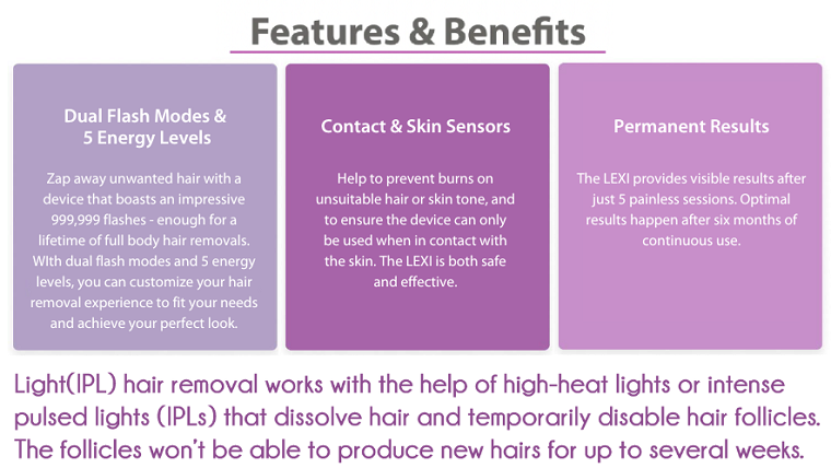 From America’s #1 skincare beauty device brand, Spa Sciences, the LEXI Pro Permanent Hair Removal System uses Intense Pulse Light (IPL) technology that is gentler on the skin than traditional laser hair removal, can be used in the comfort of your own home, and at a competitive price without sacrificing quality.