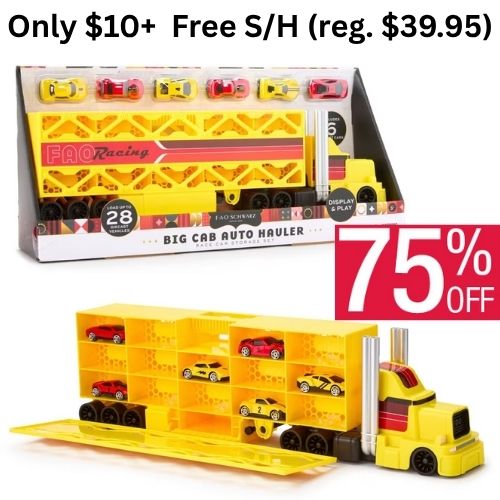 Kids can transport their diecast vehicles with this FAO Schwarz Big Cab Auto Hauler. The set includes a realistic semi-truck and auto hauler trailer that rolls, swivels, and detaches for dynamic play. The trailer can haul and store up to 28 vehicles and it comes with 6 diecast race cars. Shipping is Free and so are returns!