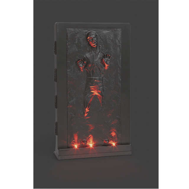 This Han Solo in Carbonite Novelty Desk Light has a stand so it can hang out on your desk but the stand is also removable so it can be hung on a wall. Red LED lights on the front are operated by 3 AA batteries (not included). Measures 18″ tall x 10 1/2″ wide x 2″ deep without stand and 4″ deep with the stand.