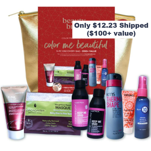 This Beauty Brands Color Me Beautiful 9-Pc Discovery Bag is filled with some of the best hair products for preserving color treated hair. It includes samples and travel size products from top brands like KMS, Matrix, Amika, Joico and more, arrives in a gold cosmetic bag, and comes with a coupon redeemable for a Free 6-foil color service.