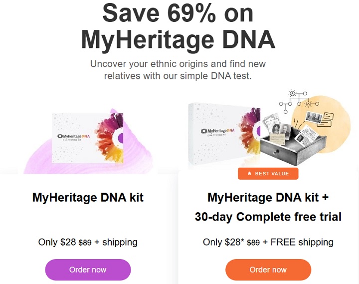 Get 69% off MyHeritage DNA kits by clicking this link to activate the coupon. If you opt for the MyHeritage DNA kit + 30-day Complete Free trial, you’ll also get Free shipping ($5 value).