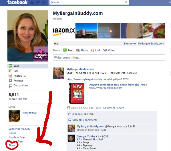 Simply log in to your Facebook account, "like" MyBargainBuddy (if you haven't already), then click the "Share" link in the left column (see this pic if you need help locating it). In the box that pops up, write a little something about MyBargainBuddy (or me!) and then hit the "share" button. This message will post to your profile and help spread the word about MyBargainBuddy on Facebook. When you're done, write on MyBargainBuddy's wall, letting me know you "shared" today.