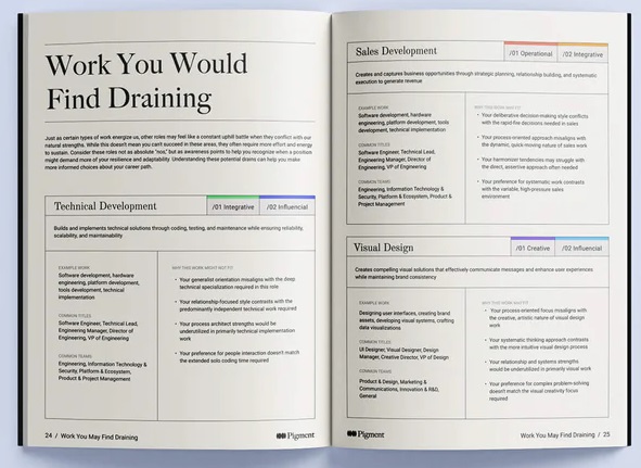 Instead of chasing titles or enduring jobs that don’t fit, Pigment empowers you to find clarity and confidence in your career path. Their method combines thousands of hours of career observations with established research to create a practical, personalized tool that maps your strengths to specific roles and environments where you’ll thrive.